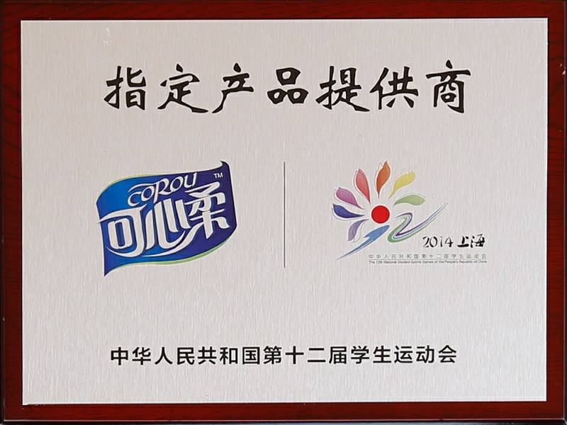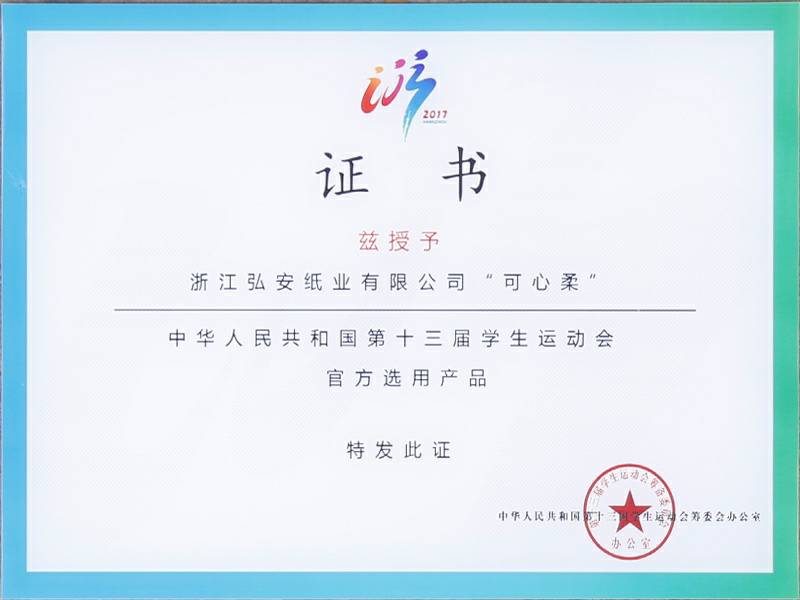 2017年9月4日中华人民共和国第十三届学生运动会在浙江杭州举行,可心柔携手中国邮政、中国平安、娃哈哈、京东校园、吉利汽车等知名企业品牌亮相大会。作为本次大会的12家合作单位之一,浙江沈阳伟华企业宣传策划有限公司纸业有限公司参加了发布会,并接受了官方选用产品的授牌。